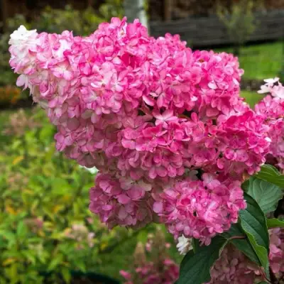 Побеги у этой гортензии — как у дерева: тёмно-бордовые, крепкие, выдерживают даже дождь. Соцветия — белые, потом розовые, а к осени становятся насыщенно-красными. Очень эффектно!