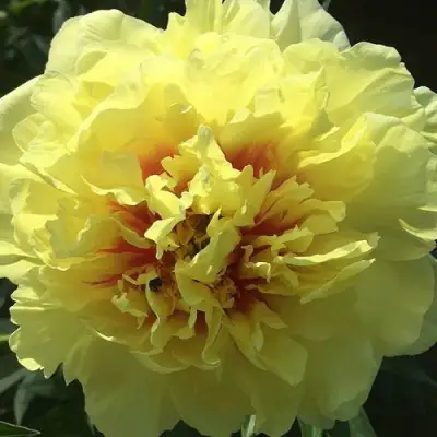 Цветки пиона древовидного "Золотая корона" имеют крупный размер около 18 см в диаметре. Они окрашены в яркий желтый цвет с несколькими красными метками-всполохами у основания лепестков. Это создает яркий и запоминающийся образ, который не оставит равнодушным ни одного наблюдателя.