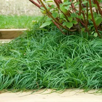 Высота растения — 15–20 см. Ширина — до 30 см. Листья — длинные, тонкие, дугообразные, насыщенно зелёные, блестящие. Весь куст формирует плотную, полусферическую кочку, от которой расходятся изогнутые листья, создавая эффект каскада. Эта текстура особенно выразительна вблизи — на границе дорожек, в контейнерах, в рокариях и на террасах.