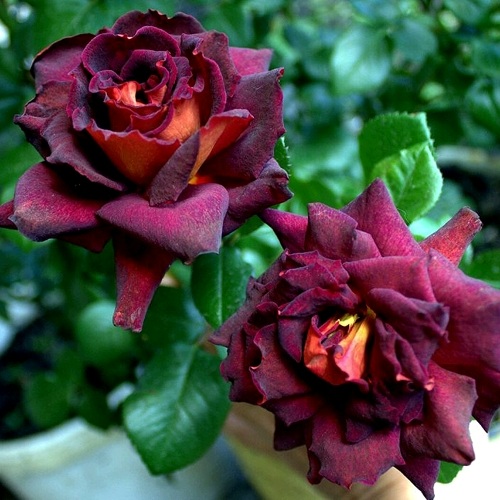 Цветок этой розы имеет кремово-бордовую окраску бутона. Окраска цветка представлена бордово-красным цветом с золотисто-кремовой обратной стороной лепестков. Цветок очень насыщенного и темного цвета.