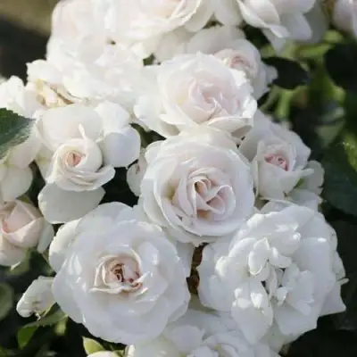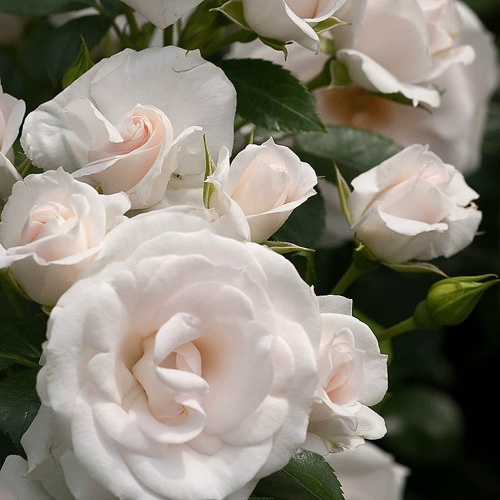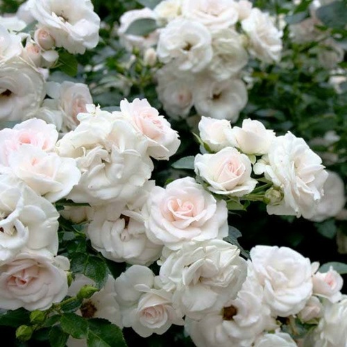 Окраска цветка данной розы может быть белой, но при неблагоприятных погодных условиях она может приобретать розовый оттенок. Основная окраска цветка - бело-розовая, а насыщенность цвета довольно бледная. Форма цветка - чашевидная, среднего размера с диаметром от 6 до 8 см. Цветок густо махровый и имеет от 50 до 60 лепестков. Цветки расположены в соцветиях, на каждом стебле может быть от 10 до 15 цветков.